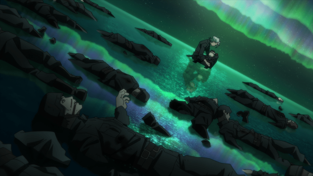 My final note for this episode is that it was well-written and well-executed. Everything came together to create an epic and seemingly hopeless situation. Fukuchi has activated the One Order, and the Detective Agency has been defeated. Fukuzawa was impaled with a blade, Atsushi is being ripped apart by Akutogawa, and Dazai has been shot in the head.