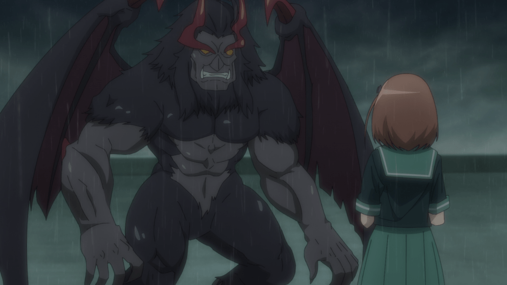 Meanwhile, at Chiho’s school, a large demon is rampaging around. He’s also using an extremely high-powered spell to bring rain and lightning down. While waiting for help to come, Chiho speaks with the demon face-to-face. She learns that the demon’s name is Libicocco and that he is here to make a ruckus to attract attention. The demonic magic in the air almost makes Chiho pass out, but Suzuno and Lucifer arrive just in time to save her.
