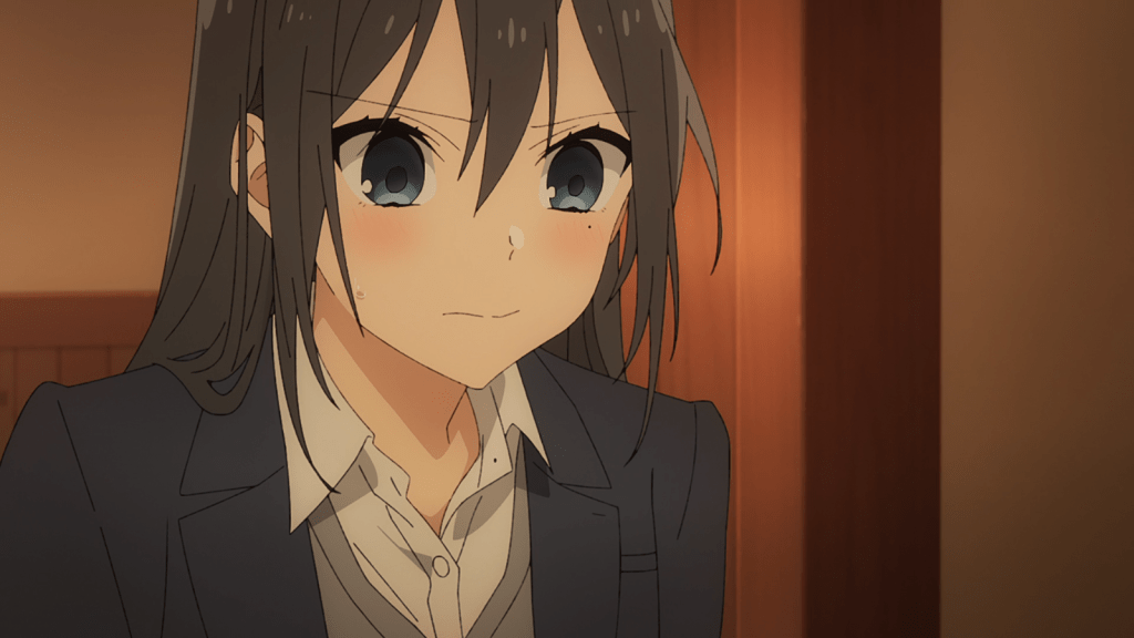 The last thing I’ll say about this episode is that Watabe’s scenes were definitely funny. He’s absolutely obsessed with Miyamura. The nature of humor, like I’ve been saying, is that some negative and toxic traits make for good jokes in the context of certain fiction. Then it’s just a matter of which jokes land for you and which fail. I don’t like it when Hori hits Miyamura, but I am incredibly tickled by Watabe’s creepy worship of Miyamura. It’s different for everyone.