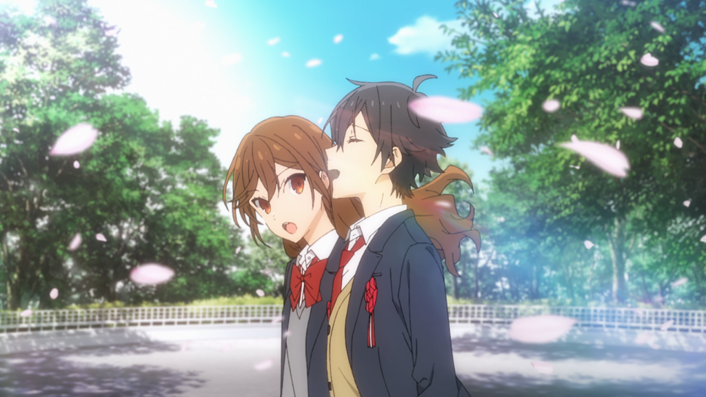 At the end of this dreamlike sequence, Hori still ends up meeting Miyamura after dropping her phone near his desk. I think the point was to be super romantic and imply that Hori and Miyamura would have fallen in love in any version of the universe. I don’t really mind this kind of sappiness on occasion – if I did, I would never have kept watching Horimiya. Kyoko Hori and Izumi Miyamura are an adorable anime couple that deserves to have some cheesy romance.