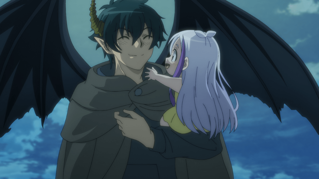 The Devil’s arrival in Heavensky was a beautiful scene – both visually and in terms of the significant for the characters. Emi finally got to see her father alive, though he’s still unconscious. Mao’s words for that moment were great. He said, “Emi, I don’t expect forgiveness for what I did back then, either. But I found a lost treasure of yours, so I’m returning it to you as a token of apology.”