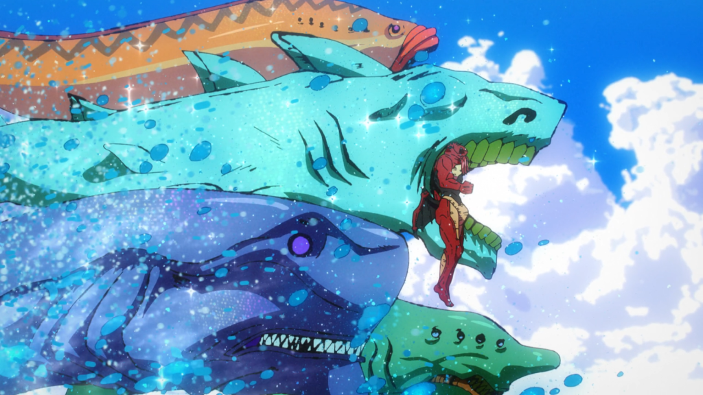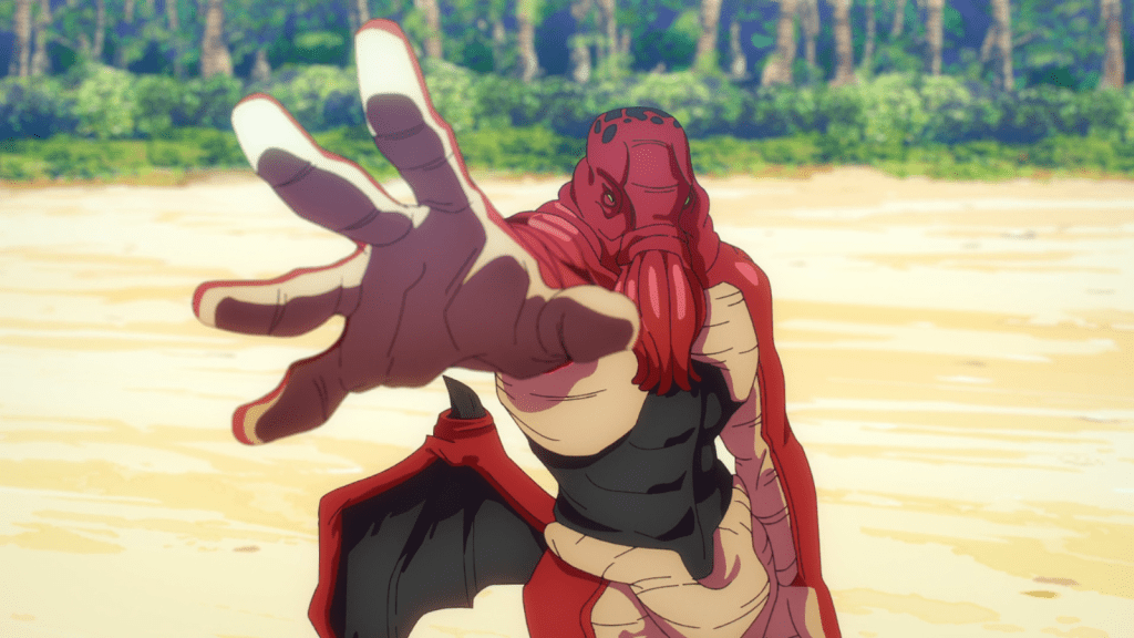 The visuals within Dagon’s domain were strikingly beautiful and vibrant. That might be my favorite aspect about this whole episode. Even the cursed shikigami in that domain are somehow pretty. Many of the tough curses in this anime are anthropomorphized concepts; for instance, Jougo probably represents humanity’s fear of volcanoes. As for Dagon, he is clearly an embodiment of humanity’s fear of ocean life. It’s fitting that his domain is a gorgeous tropical beach.