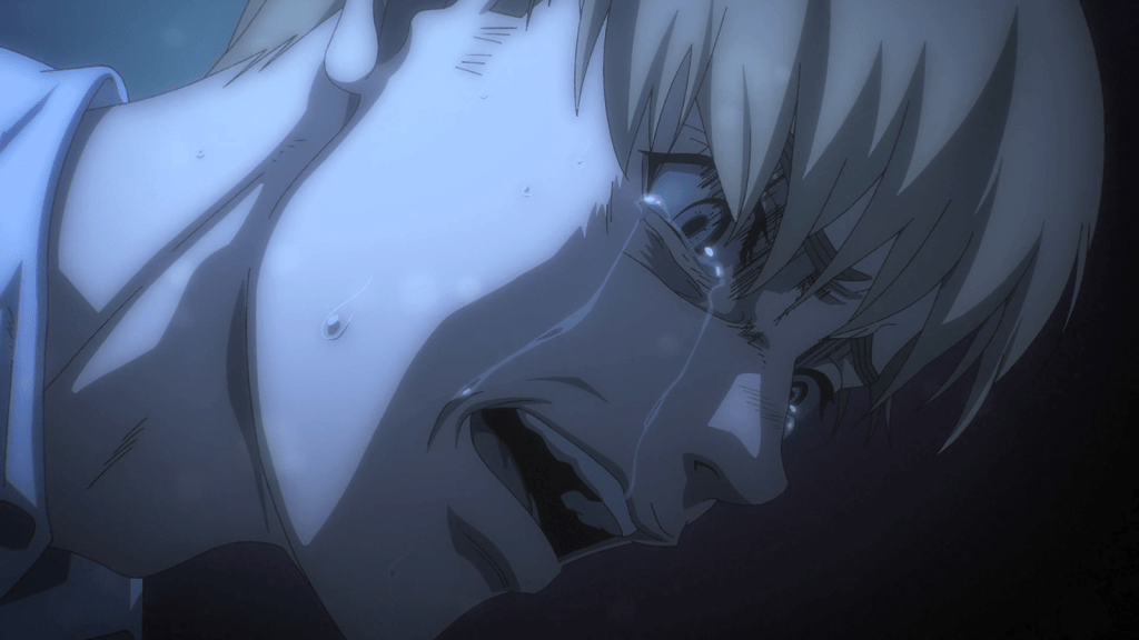 All three of the main characters are special to me in different ways, but if I had to pick one favorite, it would probably be Armin. He had many good scenes in this final episode that I want to comment on. First there was the scene where he is trapped in the titan’s mouth, being suffocated. We see Armin having an out-of-body experience, leaning over his own still body and begging it to move. He even screams at it, saying it’s useless and always lets him down. You can tell he hates himself.