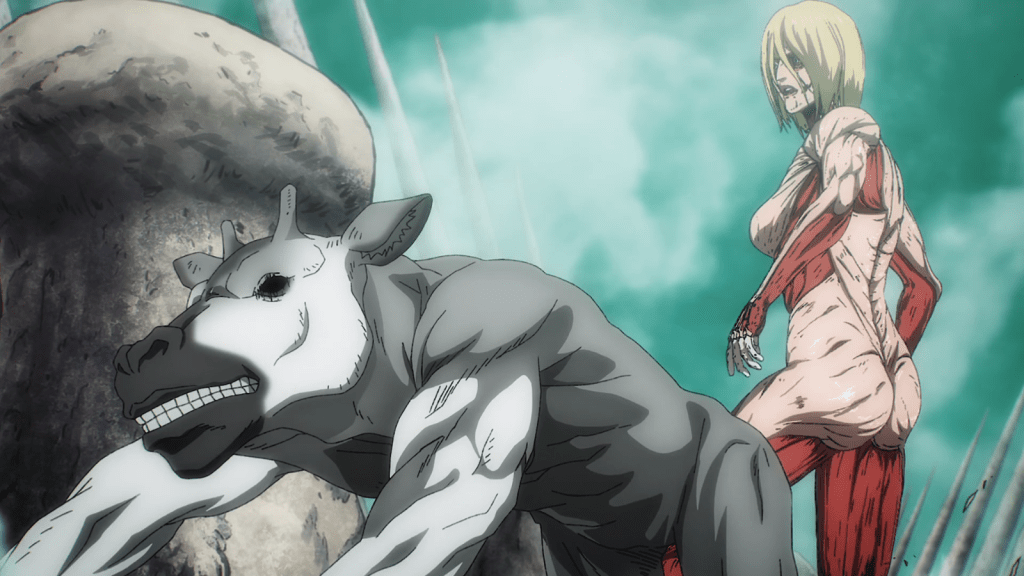 Falco is not the only titan that’s ever been capable of assuming unusual forms. Many titans throughout the last 2000 years have been able to model their forms around beasts or dinosaurs. One of the weirdest examples is the titan who captures Armin and tries to suffocate him. As Annie pointed out, it looks like an okapi. I happen to know what that is, but it’s an obscure species, so it felt really random. It was also funny to see Mikasa trying to describe it and being at a complete loss for words.