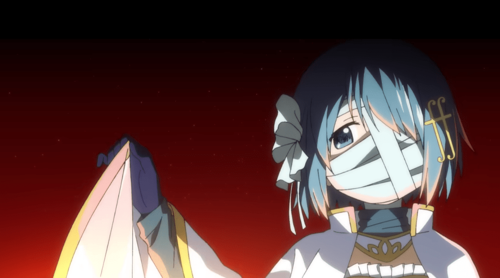 Many fans have theories about why Sayaka appears in the trailer covered in bandages. On that topic, my prediction is that Sayaka will struggle a lot in this movie, probably as a result of resisting Homura’s control. The bandages may be a metaphor for her mental anguish. Alternatively, the bandages could symbolism the fact that her true power is wrapped up and sealed. It’s also possible that Sayaka was literally, physically harmed in some way, but I suspect the bandages are mostly symbolic.