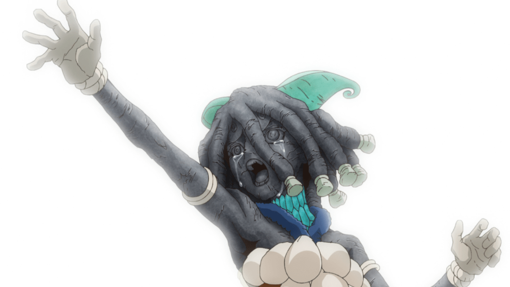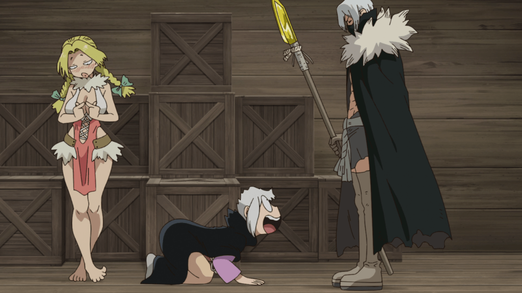 There was one other interesting part of this episode to comment on. Yuzuriha stated that it’s impossible to bring back Soyuz’s father because the surfaces of the stone are too degraded. That’s the first time I remember hearing anything like this. I thought anyone could be brought back by the revival fluid if they have most of their pieces.