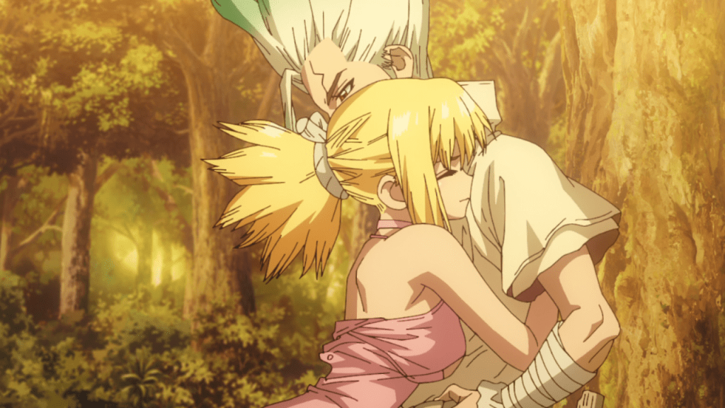 The last scene in this episode is heartwarming. Senku is the only one on the island who remains un-petrified. He starts to recall the time before he was able to awaken Taiju, when he was truly alone for several months at least. Despite Senku’s usual toughness courage, and cheerfulness, even he gets lonely. Just as he was contemplating his loneliness, Ruri called him. With the cell phone compromised, Senku wasn’t able to talk back to her yet. Nevertheless, he felt better remembering Ruri and everyone else in the village. Great episode!