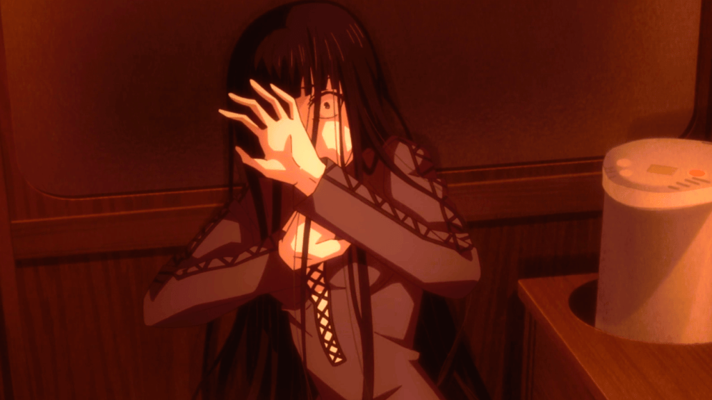During the second season of Fruits Basket, Rin is working alone and trying to gather information about the Zodiac Curse. She goes to Shigure’s house when nobody is around, looking for answers. While there, she starts to have sickening flashbacks of her parents yelling at her and abusing her. Tohru finds Rin in the middle of an intense panic attack. When Rin eventually passes out, Tohru takes care of her at Shigure’s house for a few days before convincing her to go to the hospital.