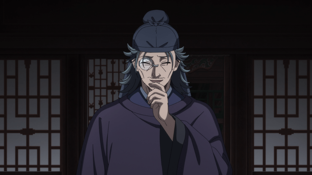 All that’s left for Maomao is to become Jinshi’s personal servant. She seems happier as a servant anyway, since she can be outside more, look at the gardens, and not be targeted by the prideful and jealous court ladies. One day, Maomao is collecting herbs along the sidewalk, when one of the court ladies tells her not to go any further. Maomao notices that the lady was telling her stay away from a military office. From said office, a strange man with a monocle watches Maomao closely.