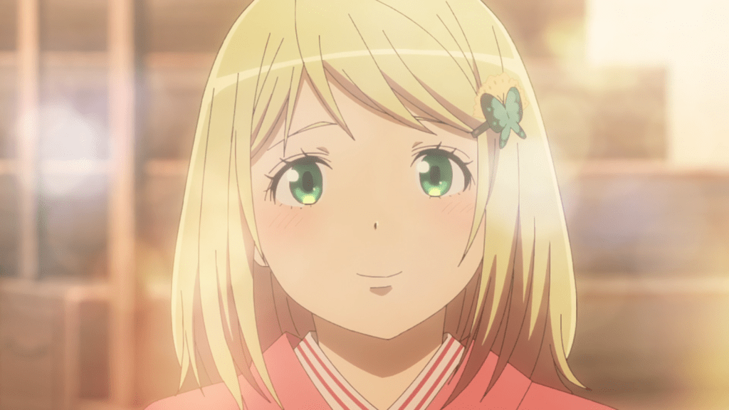 Without hesitating this time, Rin asks Shiemi to dance, which confirms in her mind that he “likes” her romantically. Shiemi is flustered, but before she can say anything, Rin takes her hand and pulls her over to where Yukio is working. He makes Yukio dance with them. The self-conscious Yukio objects to the silliness at first, but finally gives in. He dances in a circle with Rin and Shiemi. It’s a cute and beautiful moment as Shiemi admits to herself that she likes Rin back.