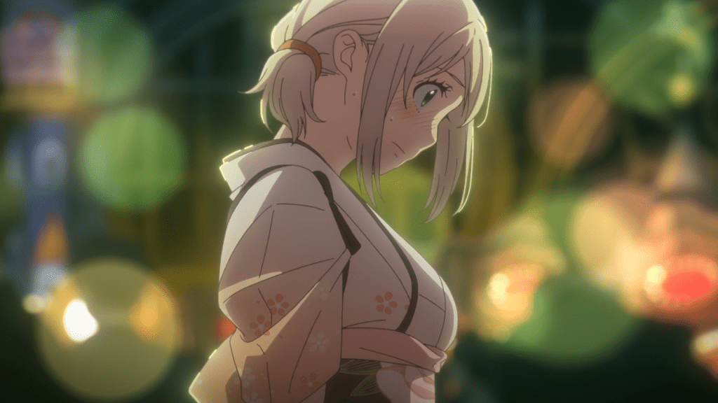 Unfortunately, things aren’t fun and beautiful for everyone. Earlier, Izumo told Rin she would come help him at the food stall. She originally had no intention of following through. After Paku urged her to be more honest with herself, however, Izumo dressed up in the goofy uniform and made up her mind to go to the festival. On the way there, she sees Nemu Takara, who urges her to stop (talking through his bunny as usual).