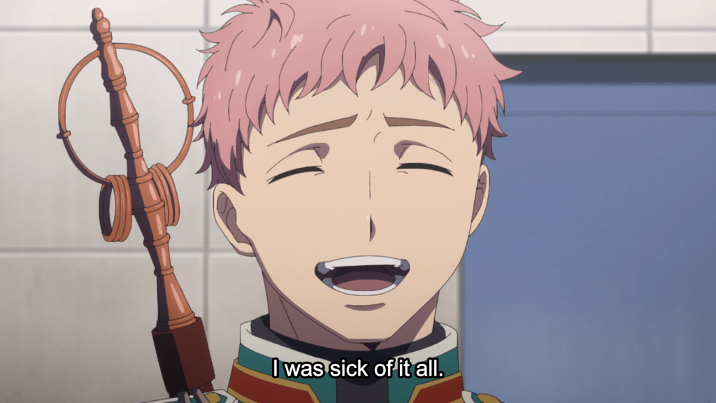 Speaking of Demons, this episode introduced us to Lucifer, the King of Light. The elder brother of Mehpisto, he is also the highest authority in Gehenna. Lucifer commands a serious presence – and even Rin could sense his overwhelming demonic power – but he has a weak, sickly physical disposition. The VA playing Lucifer is Kouki Uchiyama, one of my favorite male voices. Even if his voice hadn’t been amazingly cool, I would probably like Lucifer anyway. He seems like an interesting villain. His eyes are also gorgeous.