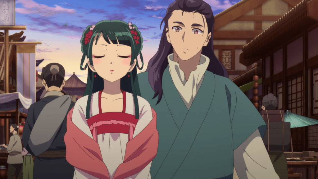 As for my thoughts on this episode, it was really nice and cute to see Maomao and Jinshi walking around town together as if they were on a date. I didn’t always like Jinshi that much, but I’ve grown to love him. I totally ship Jinshi and Maomao now. Also, Maomao looked so cute and pretty in that pink-and-white outfit. Adorable!