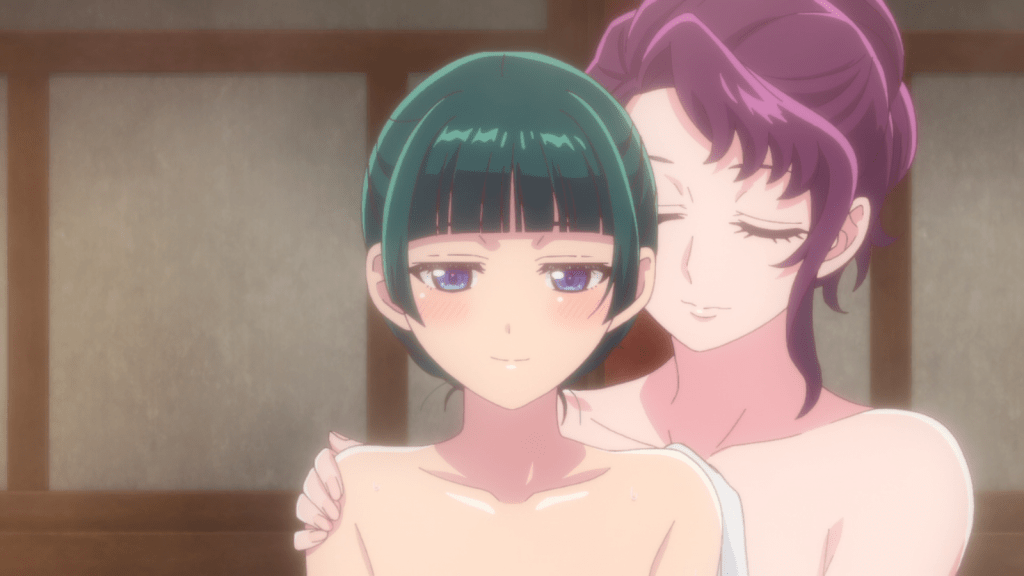 Also, speaking of the courtesan house, it’s great that all the ladies there love Maomao and make her feel better. They’re all her big sisters who like to baby her to some degree. The bathing scene was one of the only moments in this episode that wasn’t unpleasant.