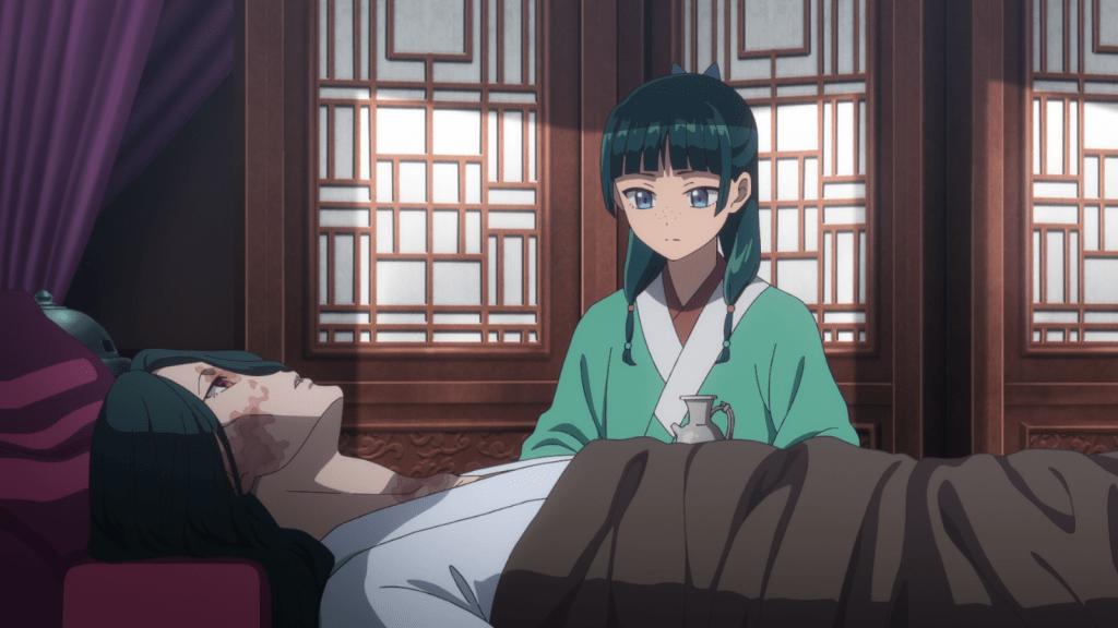 This was a big episode with many significant reveals. The main surprise for me was the existence of Maomao’s “mother,” the courtesan who birthed her. I thought she would be dead, but she has been kept alive by the grace of the Verdigris house, who gave her a private room to live in. She is isolated there because she’s dying from syphilis. Although Luomen continues giving medicine to the sick woman, he can’t cure her condition.