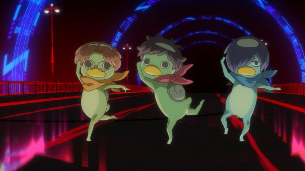 Rather than asking what makes Sarazanmai absurd, it may be more productive to ask what in Sarazanmai isn’t absurd and go from there. There are some interesting themes and discussion material for topics like human desire, family relationships, and personal redemption. By and large, though, Sarazanmai is absurd in every way. The premise is goofy. The fights, songs, and dances are funny and so random. The creatures and spirits look hilarious (and sometimes cute). Nearly every situation is absurd.