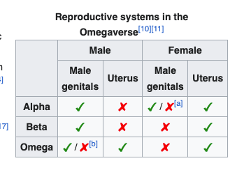 The best way to think of it is that there are males and females who at some point awaken to an additional sex: Alpha, Omega, or whatever. Also, it’s important to note that in many Omegaverse works, Alpha and Omega essentially replace the categories of male and female from a traditional standpoint – i.e., the Alpha is the masculine and protective one, while the omega is the feminine, nurturing caretaker. This does depend somewhat on the particular work, but as a general rule, society will treat Omegas as women and Alphas as men.