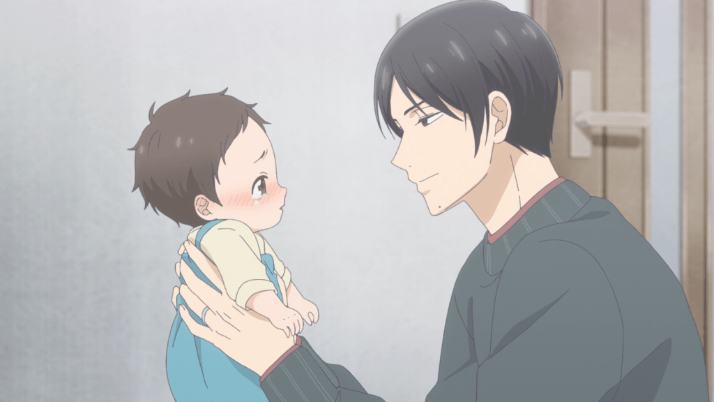 So far, my favorite character is the husband, Hiromu. He handles things really well at home and brings a cheerful but wise energy. In the second half of the episode, Masaki went into heat, a painful phenomenon that befalls Omegas. Hikari had to leave Masaki alone so he could rest and recover. But it’s hard for a baby to be reasonable when all they want is their parent. Hiromu handled this very well, convincing Hikari to be patient. I liked his lines during that little talk.