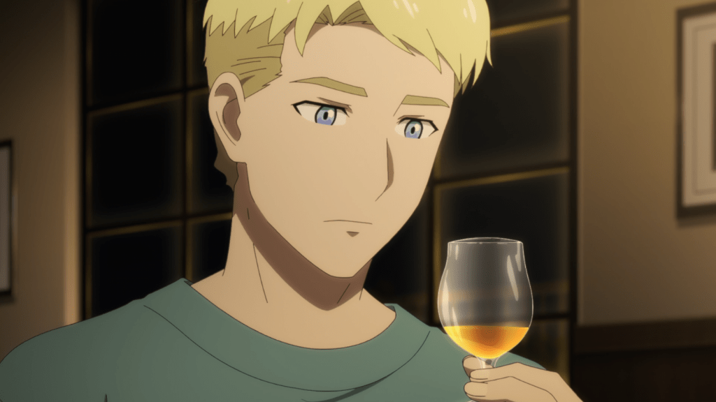 The episode began with our main bartender Ryuu going on a trip to a famous whiskey distillery with Miwa, Yuri, Kyoko, and one surprise guest. Kelvin Chen, the quiet but handsome bartender from Bar K, was invited by Ryuu. Aside from the portion of touring the whiskey facility, most of the episode focused on Kelvin. (Note: the VA for Kelvin is Makoto Furukawa, who also played “President” Shirogane in Kaguya-sama, among other roles. His deep voice can be surprisingly soothing when he’s not in a comedic role.)