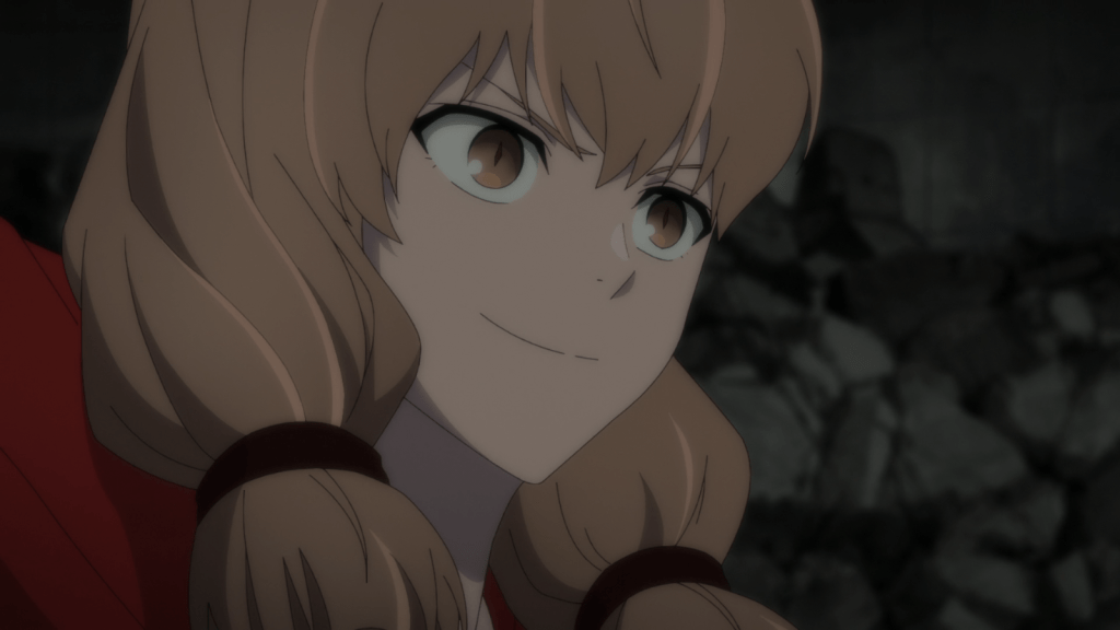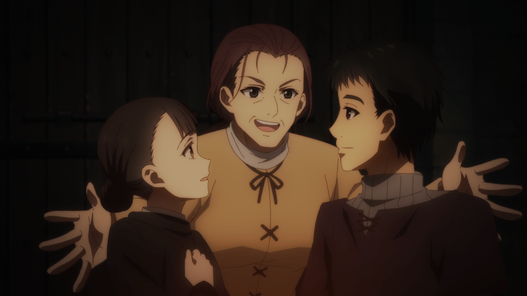 Ms. Iima, the tavern owner, helps protect Evan and Elsa inside the church while Holo finishes reading the book about the pagan bear god. According to the story within it, the old gods of the land fled and escaped the bear before they were devoured. This puts Holo’s mind at ease, since it means her friends are probably still alive somewhere. With that out of the way, it’s time to start the escape plan! As usual, this episode was intriguing and enjoyable. I love Ms. Iima and her gruff, protective nature.