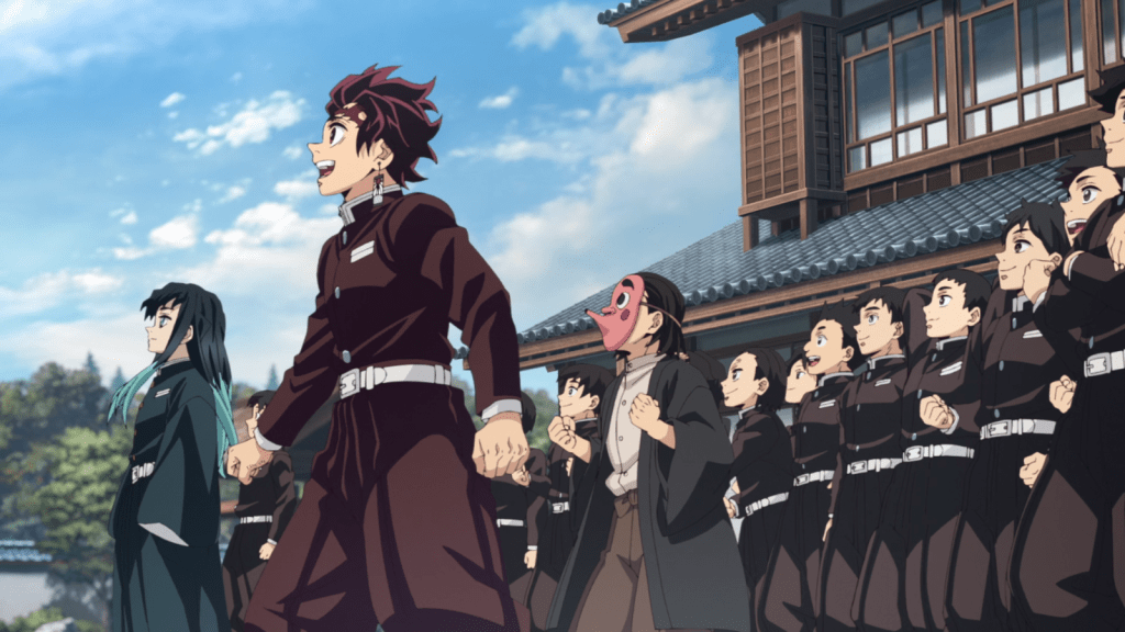 Tanjiro loses the contest, but his goal of humanizing Tokito – for the sake of the other students – was completed. The students all got to see Tokito being a normal, happy boy. As a result, they could relate to him and get through the grueling training easier. Tokito and all the students then spent some time together making paper airplanes. As they launched their planes all at once, everyone felt joyful and connected to each other.