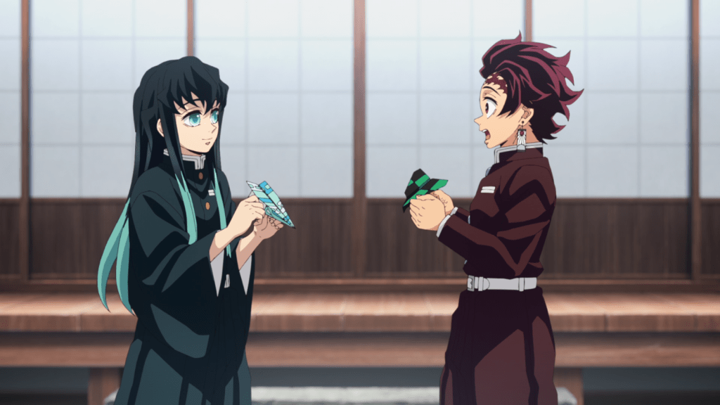 It’s great to see this boy so happy and expressive after all the pain he’s been through. In Hashira Training Arc episode four, Tokito gets to reclaim a little bit of his childhood. Despite spending the majority of each day training, Tokito sometimes has time for the classic, childlike hobby of folding paper airplanes. After hearing about this, Tanjiro suggests a contest with Tokito to see whose plane can fly farther. Tokito happily accepts the challenge.