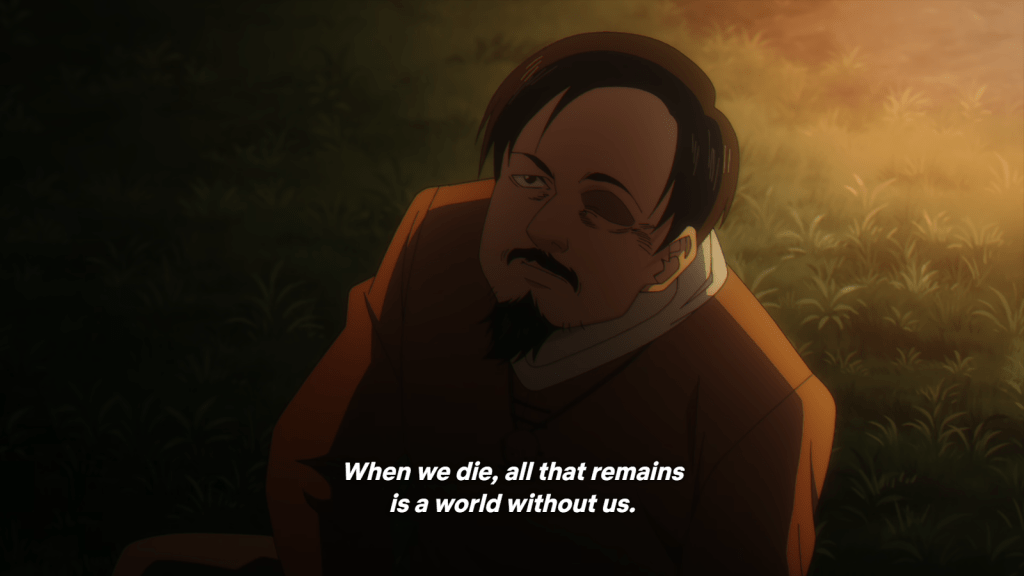 That makes it even sadder when Gras gives the rest of his life to save Orczy at the bridge later. But it also was super empowering to see him “passing the torch.” He died content. Another benefit about the material world is that it will continue after you die. Therefore, you don’t have to abandon all hope of improving it. You just need to pass the torch on and trust the next generation to also work on improvement.