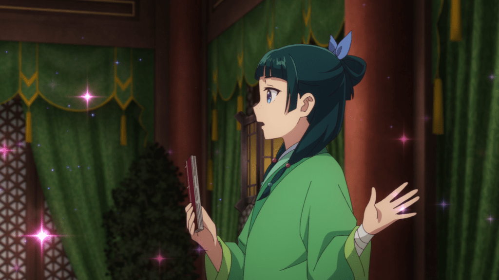 There were some brilliant directing choices made for the visuals in this anime. For example, to show humor or an exaggerated expression, the art sometimes briefly switches to a chibi style wherein Maomao has cat ears (and sometimes a tail). These scenes Maomao’s humorous expressions in general are delightful. I also like the sparkly shoujo backgrounds used in many shots. As you can see, the art in Apothecary Diaries is S-Tier all around.