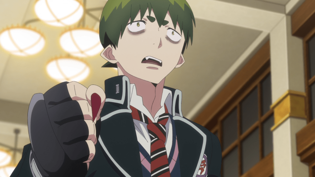 In a surprising turn of events, the demon boy Amaimon turns up at the exorcist school wearing one of their uniforms. He may have transferred in thanks to Mephisto. Given how violent he can be, though, it seems like a bad idea. In this episode, for instance, Amaimon tries to punch Shiemi. She was standing up to him and trying to defend Rin, who was in a state of shock from being rejected. Thankfully, Rin came back to reality quickly and stopped Amaimon from hurting anyone.