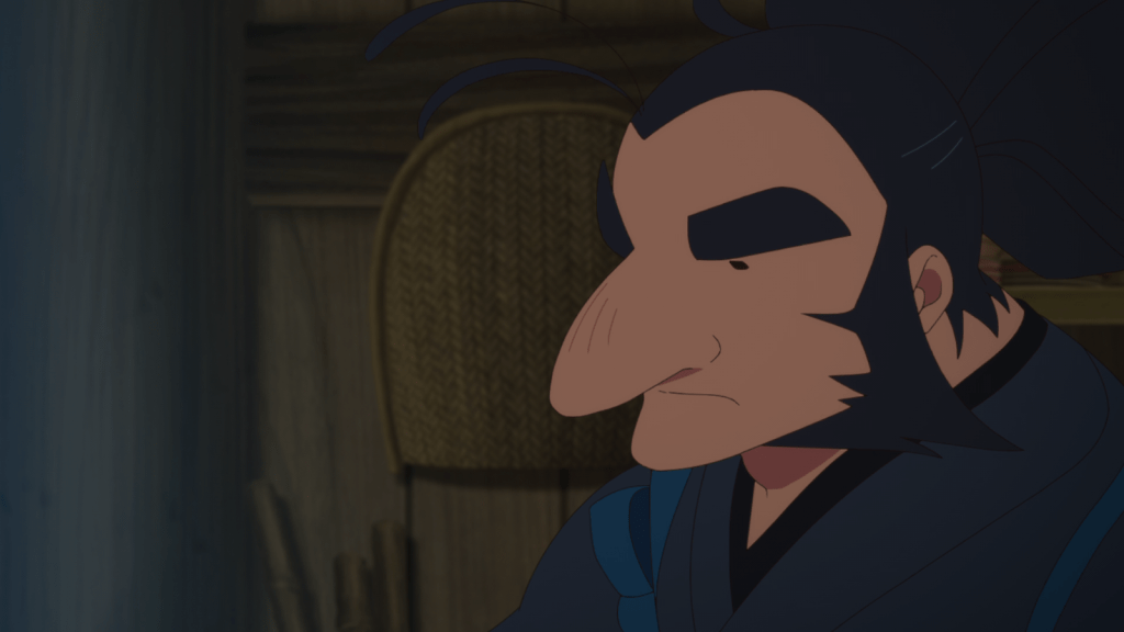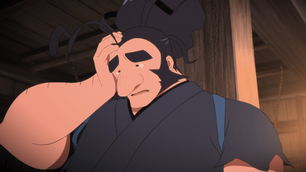 It’s impossible to talk about Tauemon without talking about his fearfulness. Nobody wants to die, but samurai are expected to throw away their fear of death when they duel others. That, or they are skilled enough to be confident that they will win any fight. Tauemon is not a particularly skilled swordsman and cannot simply throw his fear away. As a result, he reacts to conflict with a strong fear response. When there’s nothing at stake, Tauemon will run. When there are others to protect, he stands his ground, but trembles visibly. It’s a good thing Sakuna is around.