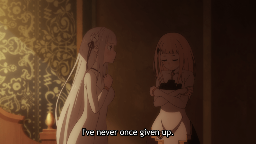 Emilia asked Aldebaran to deliver the information to Subaru. Aldebaran was happy to help. He told Emilia to be safe, surprised by how calm and confident she was acting. I was also surprised by Emilia’s strength in this episode. Even she herself seems mildly taken aback by it. She’s determined to stay a bit longer to protect herself and the other captive women, including Number 184.