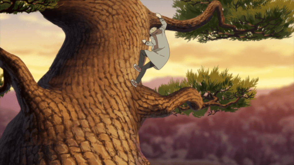 Natsume and Nyanko-sensei were having difficulty finding anything. Soon, the other ayakashi from the “Dog Circle” joined in the search. They all wanted to help Natsume and Chobi. Eventually, someone spots a glittering item in a huge pine tree on a cliff’s edge. Natsume bravely climbs the tree and grabs the item. Sure enough, it’s a dragon scale. Natsume feels grateful for all the help. He couldn’t have done it alone.