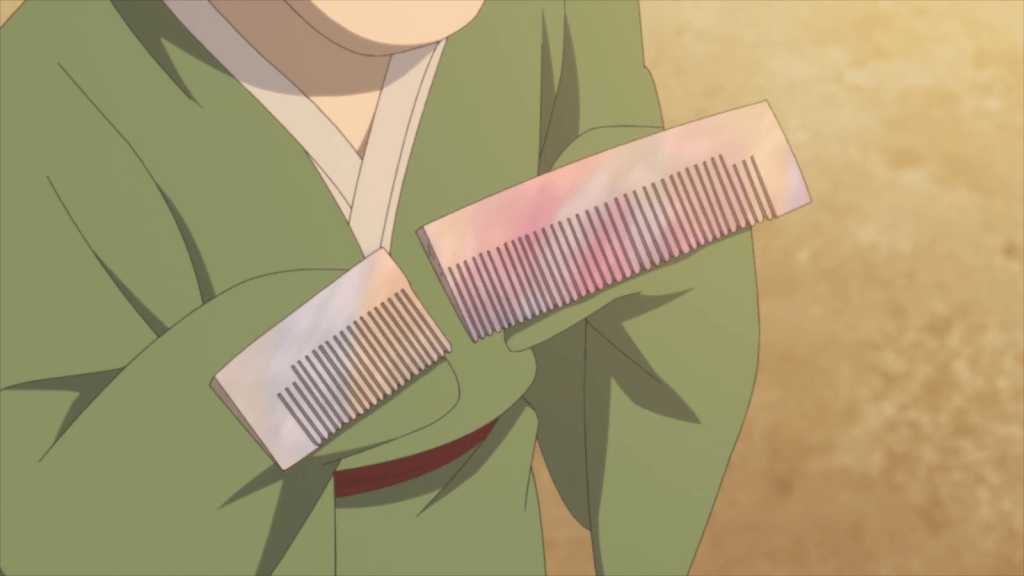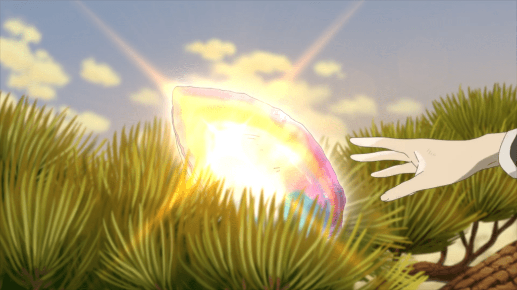 This episode was simple and charming. One day, Natsume sees a white dragon in the sky. It seems to be molting, dropping sparkling scales. While trying to find one of the fallen scales, Natsume encounters Chobi. The old ayakashi is depressed. Apparently, his most treasured possession – a beautiful comb made out of a rainbow seashell – broke in half. Chobi mourns because he knows it may be a long time before he finds anything that beautiful again.