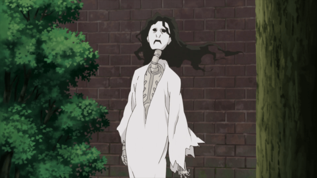Matoba’s group and Natsume worked together fight the enemy yokai, which was apparently an artificially created yokai that resembles an extremely tall, skeleton doll. Its appearance was genuinely unsettling, and for a puppet, it was very powerful. Natsume and company managed to blow off one of its arms and knock it down, but the creature wasn’t finished yet. At that moment, an even more terrifying yokai descended from the sky. It doesn’t have a name, but I call it the Eye Eater.