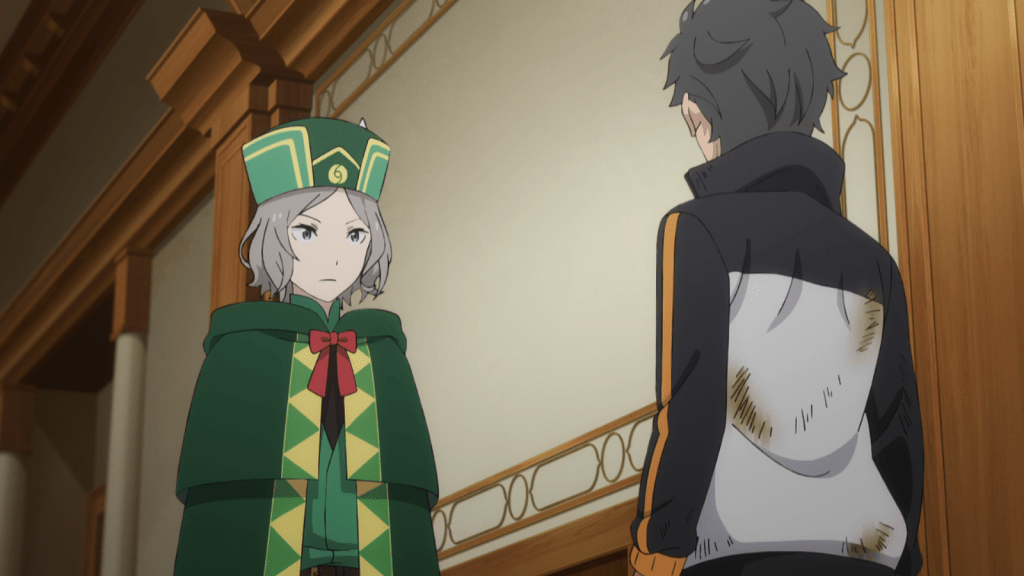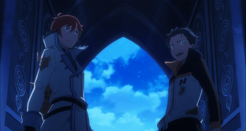 The last scene in this episode shows the “wedding” of Emilia and Corneas Regulus. Long story short, Emilia managed to stand up for herself and tell Regulus that she won’t be his woman. Regulus lost his temper and would have struck Emilia, but at that moment, the chapel door was kicked clean out of its hinges, flying across the room and crashing into Regulus. In the doorway stands Subaru and Reinhard, ready to fight. It’s an excellent ending as Subaru announces, “I’m here to steal your bride!”