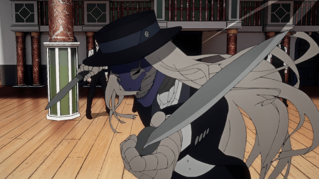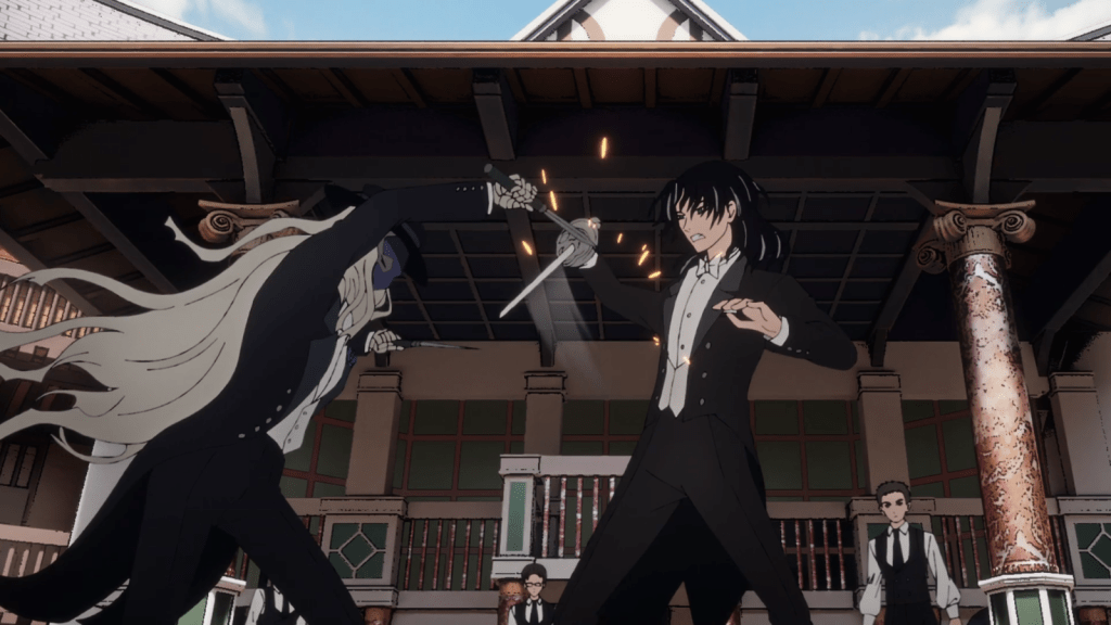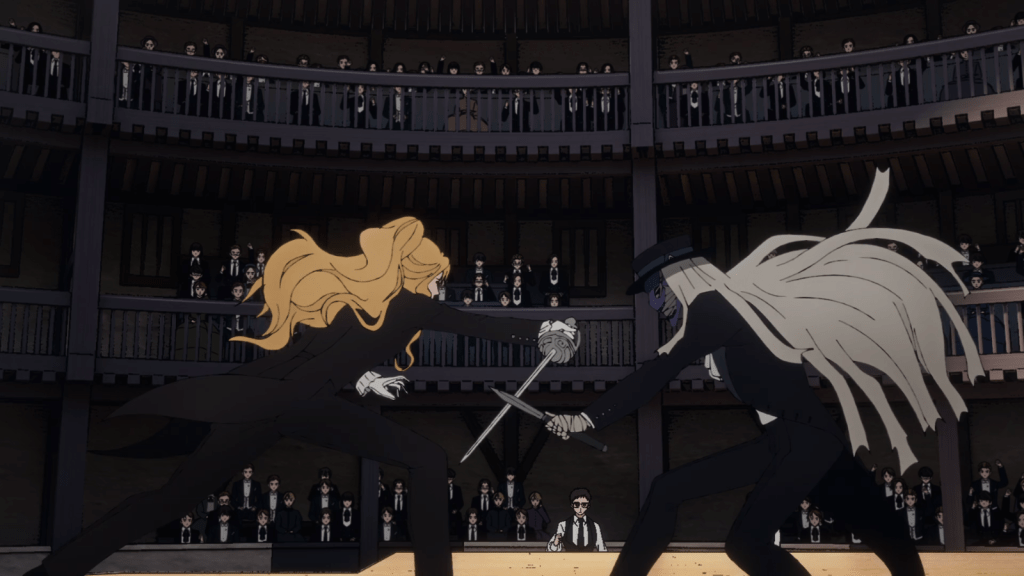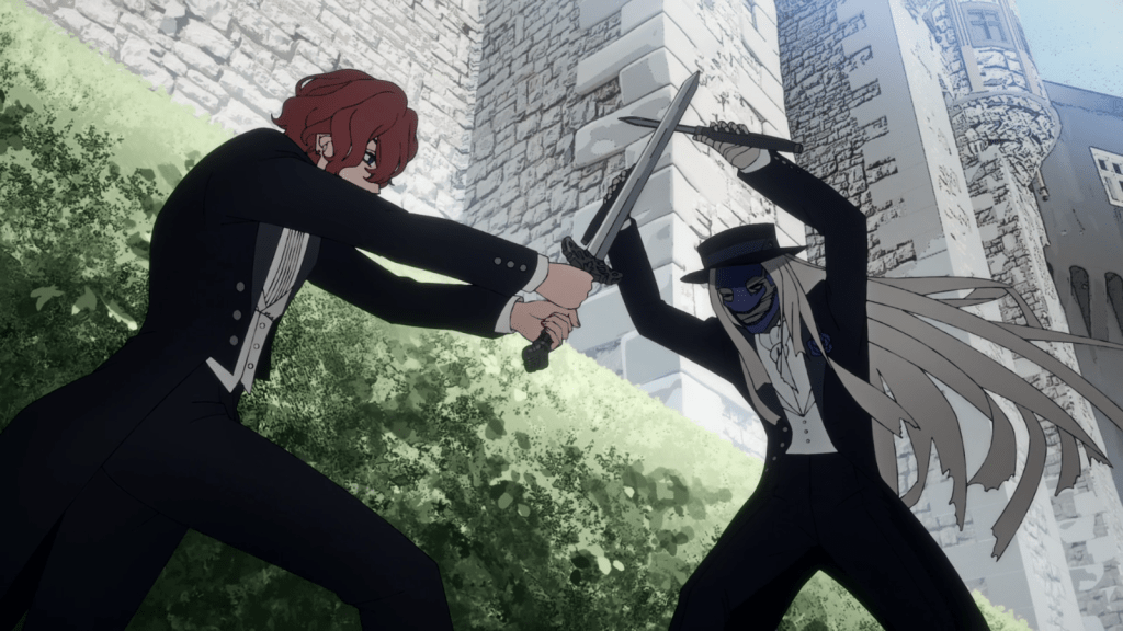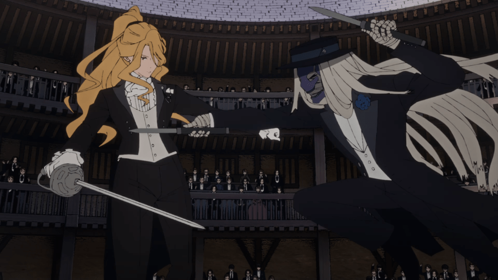 Though Dino was able to push Juras out of his mind, he still collapsed from blood loss. Luckily, Dali and Gerhard are there to pursue Juras and Katarina, while Lord Johannes and Clara tend to Dino’s injury. Dali and Gerhard follow Juras to a stage where some young vamps are having a fencing tournament. What follows is an excellently animated action sequence as the two vamp aristocrats take up their sabers and fight with the dual knife-wielding Juras.