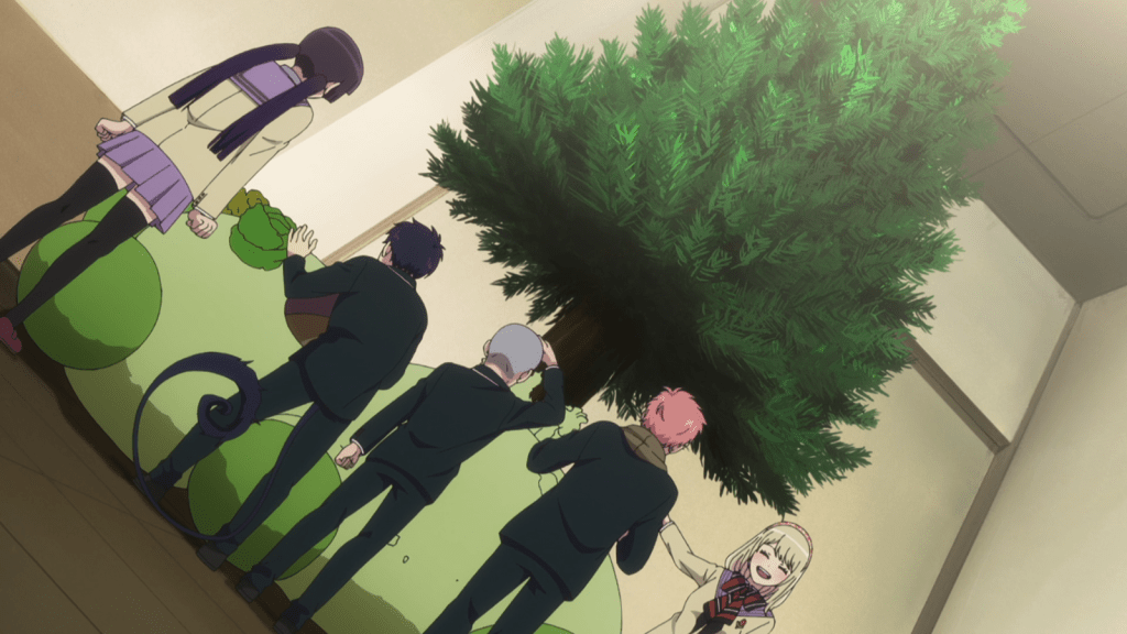Everyone helps get ready for the party. Izumo and Shima, for example, purchase a fancy cake, while Suguru, Yukio, and a few others make paper decorations. Shiemi even brought a real Christmas tree by making Nee sprout one out of his belly. Unfortunately, Nee rolled over in his sleep, and the tree toppled, destroying everything. Even the cake got ruined, and there was a small fire that had to be put out.