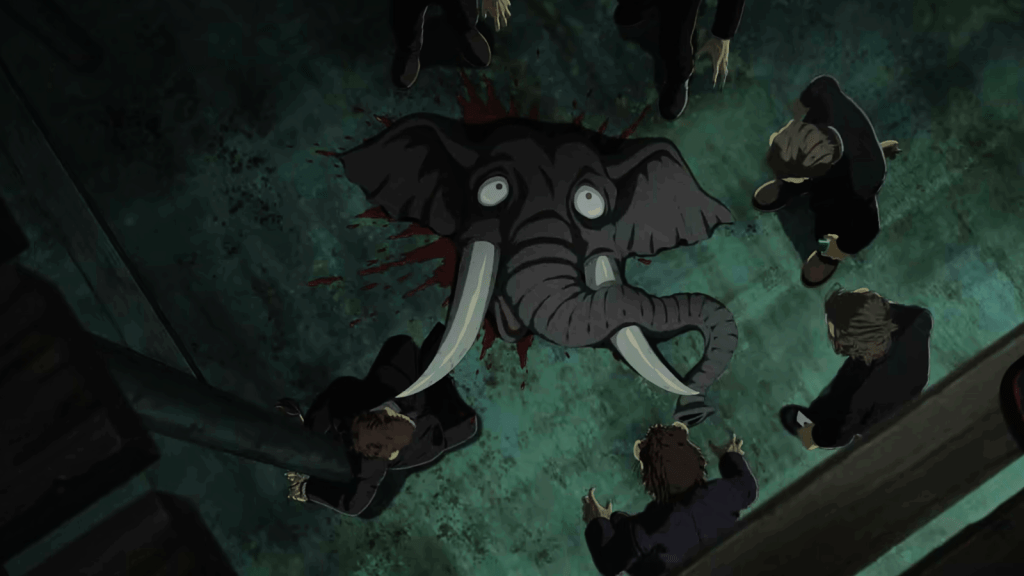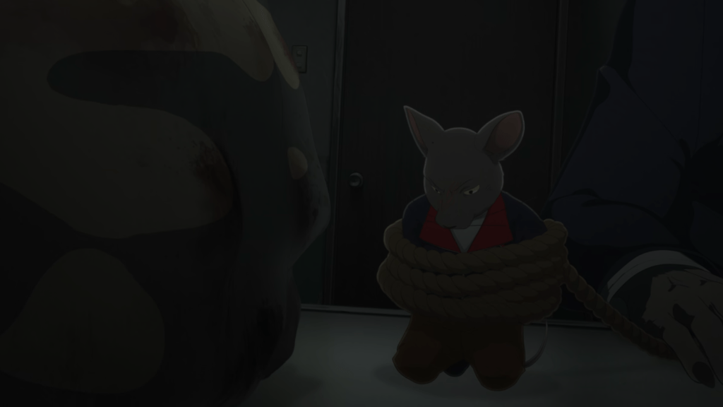 The scene switches to the city at night. A gang of rats steal a bunch of drugs that were going to be sold on the streets. Since the rats are vigilantes, the cops do not treat them kindly. There’s an extremely brutal moment where a large dog in the police force traps the small rats in a cloth bag and proceeds to slam it against a concrete wall repeatedly, leaving bloodstains. The leader of the rats is tied up and helpless to save his brethren. However, Yahya the Beastar charges in and saves the rats, reminding the brutal cops that even the smallest animals have the same right to life and dignity.