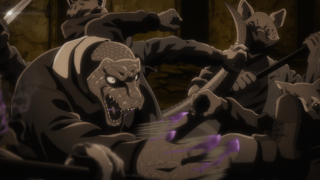 The komodo dragon begins savagely attacking the birds. Legoshi is stunned to see his pacifist granddad kicking so much ass. The episode ends there, but just to make this reveal even more awesome, there’s a special ending song and animations. The music video tells of the legend of Gosha, an incredibly powerful fighter for justice in the underworld. For years, he ruled the streets. His full story is yet unknown, but before he retired, he was one bad-ass lizard. To be continued.