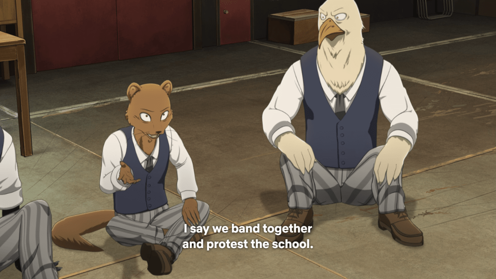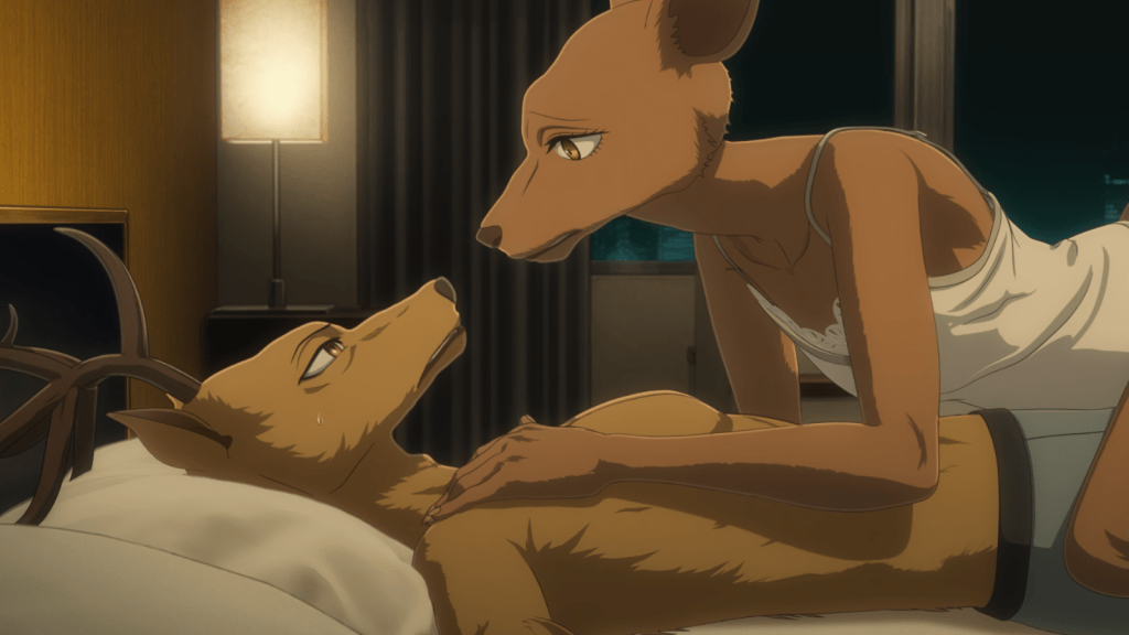 Even though I was prepared for this from a Japanese anime, I’m still disappointed. However, something interesting did occur to me that softened the blow. According to the vibes I’m getting from this story, in the world of Beastars, interspecies dating is far more taboo than queer sexuality. Ideally, the narrative would have showed this to viewers by normalizing same-sex relationships, but that’s too much to expect from Japan apparently. Still, the fact remains that Louis is in a marginalized group that’s demonized for its sexuality. So, yeah, in this world, Louis might as well be “queer.”