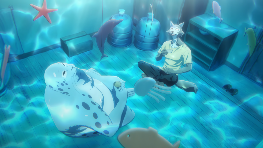 I loved the wholesome ending of this episode. There’s a scene where Legoshi and Sagwan sit together and bond in the apartment, looking at the ocean-themed decorations and feeling almost like they were underwater for real. Legoshi’s sense of wonder and joy is obvious. This scene encapsulates one of the core themes of Beastars – and it’s a positive one: the sheer wonder of learning about other types of people. It’s the delight of interacting with someone who is different from you.