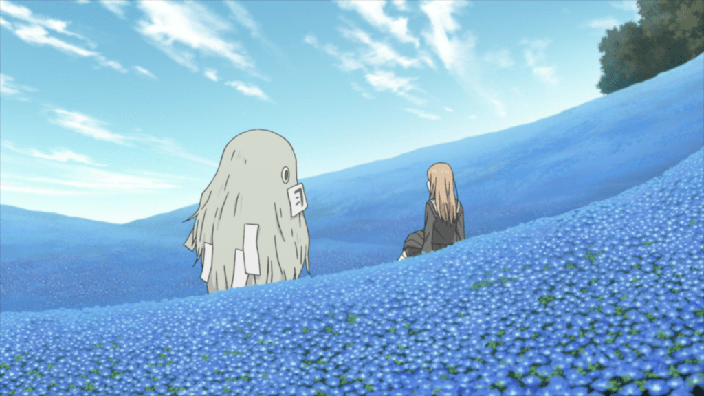 Now that he’s heard the full story, Natsume returns Soranome’s name, setting him free. Due to his spiritual connection to his grandmother, Natsume also sees a dreamlike vision of the blue flower field. He saw how much Reiko wanted to be there with Soko. The beauty of the flowers and the sadness of the story nearly brought Natsume to tears. He is such an empathetic boy, and he also deeply appreciates natural beauty.