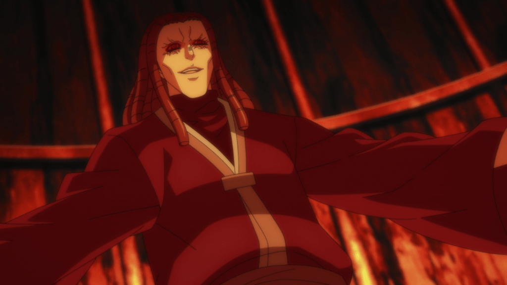 As the fight continues, it becomes clear that Bam is more powerful than before. He has unlocked the power of the Thorn of Enryu. It’s around this point where we hear Reflejo’s tragic backstory. His family was slaughtered by a Princess of the Ten Families. For some reason, she allowed Reflejo to live, but blinded him for beholding her “beauty.” That’s why Reflejo hates the Ten Families and joined FUG to fight them. To be honest, that’s understandable. Under his mask, his eyes are sewn shut.