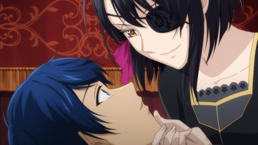 Anyway, he says he hasn’t forgotten Alicia and will be waiting for her once she returns from Laval. It’s all very romantic and whatnot. Alicia and Duke then have their first consensual kiss and Alicia finally departs. She leaves her home country and enters Laval in a blindfold. Alicia is still determined to be a great “villainess” someday. The episode ends after that, but there’s something I nearly forgot to mention: the black rose.