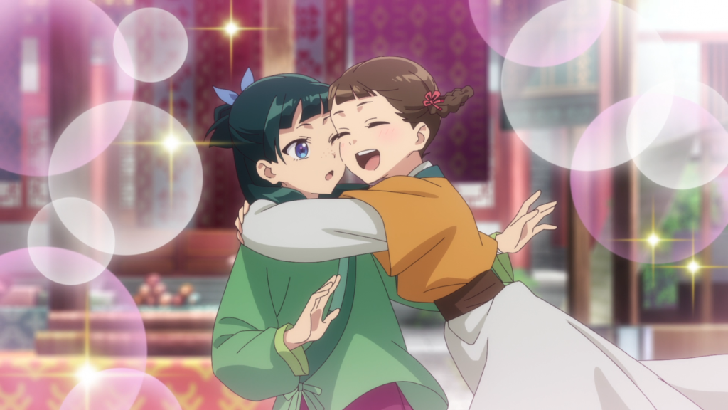 There were a few cute moments with Maomao and Xiaolan being besties. Since she got an allowance from Gyokuyo, Maomao could do some shopping on the last day of the caravan. She went with Xiaolan and bought cute pink hair ribbons for the younger girl. Xiaolan was delighted. It’s good to see Maomao showing normal affection for others.