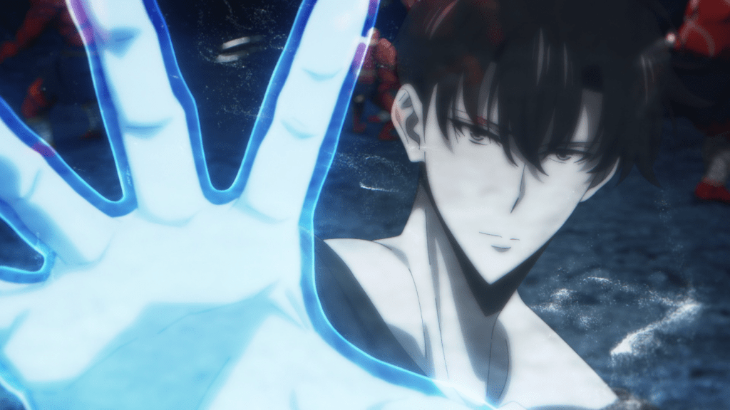 As I mentioned in the article introduction, this episode had amazing visuals. The 3D High Orcs in the background looked slightly off in a few shots, but I think generally, Solo Leveling uses 3D in a well-blended way. It’s soon obvious that the King of the High Orcs, Karalgar, is far stronger and more skilled with magic than any of the A-Rank Hunters. After Karalgar brutally beats Kihoon to a pulp, Jinwoo steps in and summons his unded army. It’s no longer possible to hide his strength, so Jinwoo goes all out.