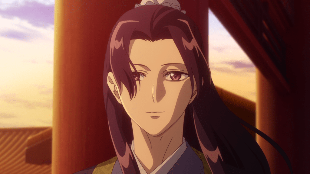 In the last scene, Anshi talked to Jinshi in the light of the sunset. She knew he was the biological son of Emperor Pedo. During the talk, Anshi asked how Jinshi felt about Maomao. He said she was very useful, but Anshi could tell there was romantic attachment under the surface. She smiled and warned Jinshi to hide his favorites, lest they be stolen away from him. This hearkened back to the earlier discussion of Jinshi’s toys when he was a child.