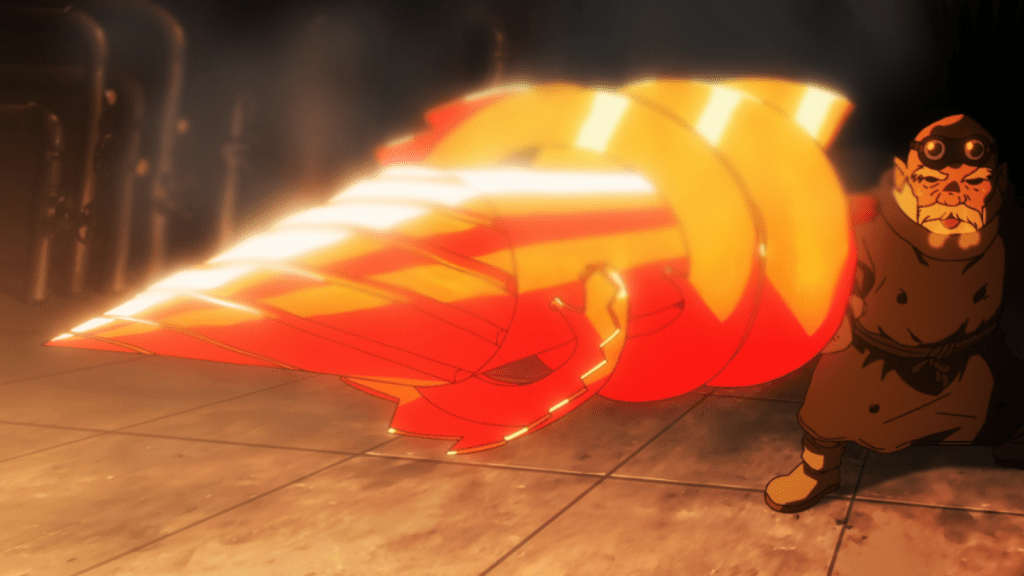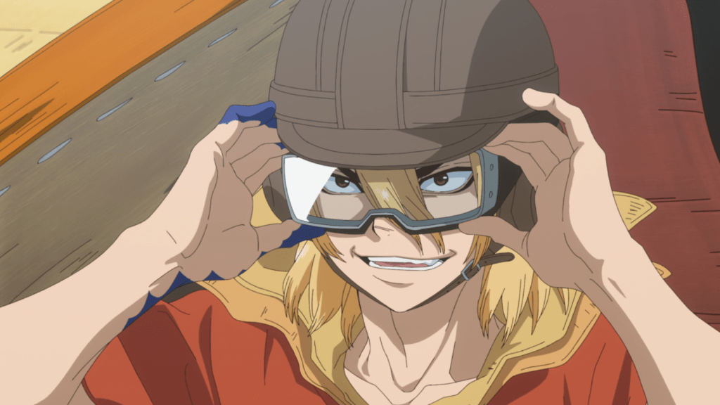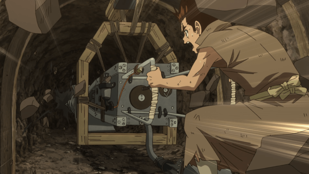 Kaseki completed the drill as instructed by Chrome. The old craftsman has always been a great character, and he’s eternally helpful to the group. I like seeing this character even briefly. It was funny how he assumed the drill was a deadly weapon, calling it a “Spinny Sword” (Guruguru Katana). Anyway, the group needed a way to get the heaby machinery to Chrome. So, Taiju set out in the science vehicle to deliver the drill.