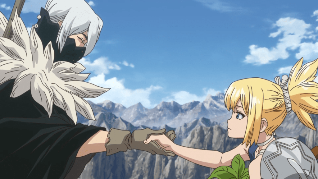 Senku’s group made a ropeway pulley system and crossed the mountains. Suika nearly fell to her death, but Kohaku saved her. There was an important moment where everyone realized that they were one team now. Hyoga and Xeno had several opportunities to escape or take down members of the team like Kohaku. However, they did not act on any such plans. Hyoga even extended a hand to help Kohaku climb up over the cliff edge with Suika. Even though Hyoga has different ideals and was violent in the past, he seems to be working with the team very well now.