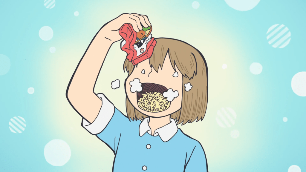 This installment featured a lot of cute and hilarious moments. For example, Ecchan finally told Matsuri that she would be moving to England, and the girls decided to spend as much time together as possible. These two are adorable. In another humorous scene, Niikura narrated in detail her special ritual of eating dried ramen in the middle of the night in a very scandalous manner. I also loved the parts about Mr. Makabe making fried rice and the barber who puts money back into the town. Great episode.